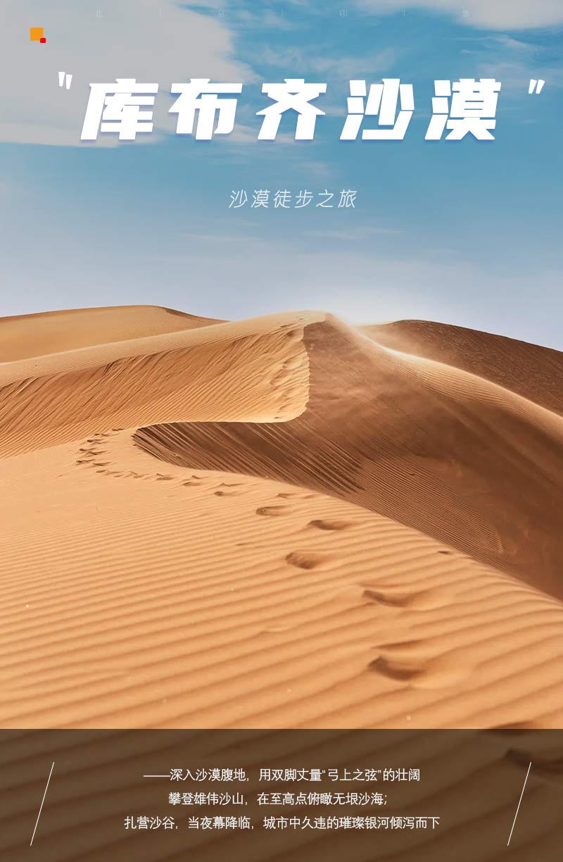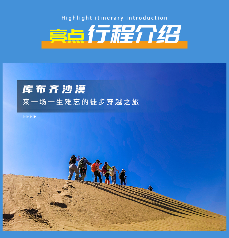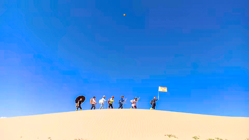 在沙山中行走要求队员有更好毅力与耐力,跟紧领队的步伐。途中需翻越几座比较高沙山,跨越穿沙公路,中途在沙漠中的绿洲边休息、路餐(注:每人需准备2-3升水,午餐1份)。*如不想徒步的朋友也可以直接前往银肯塔拉游览,体验沙漠骆驼、滑沙、沙漠缆车、沙漠越野等项目(费用自理)!