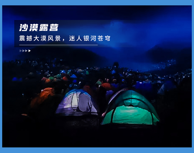 - 晚上营地露营,这里有物资补充,您也可自带腐败物资;这在广袤无际的草原深入,体验终身难忘的快乐。夜深了,漫天银河繁星,坐在帐篷里尽尽的发呆吧,然后慢慢入眠,真正体验沙漠露营的奇妙感觉!
