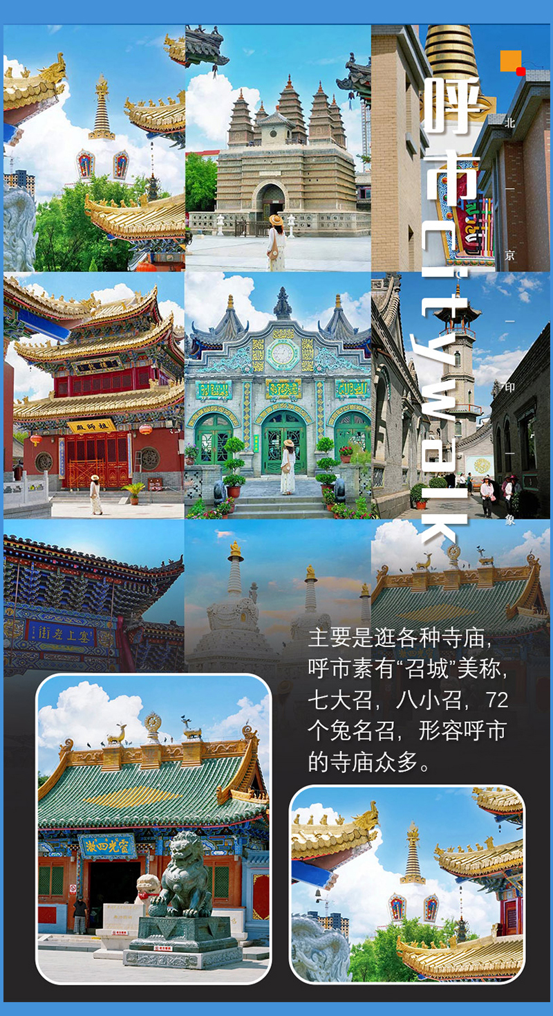 根据自身需求、时间选择相应景点。可以逛各种寺庙,呼市素有“召城”美称,七大召,八小召,72个兔名召,形容呼市的寺庙众多。