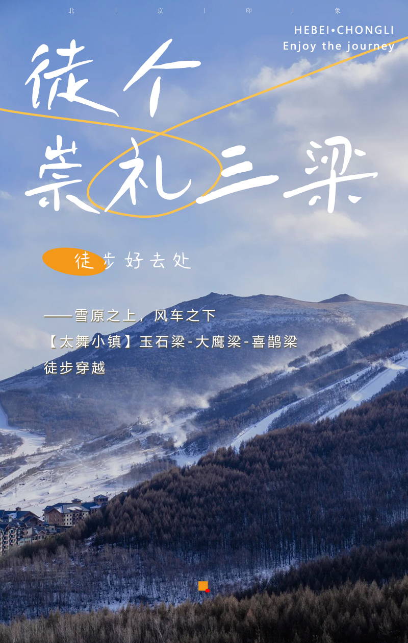 线路串联起玉石梁、大鹰梁、喜鹊梁几道山梁,穿越高山草甸、白桦林和风车阵,视野极为开阔。是河北崇礼一带备受户外爱好者推崇的经典徒步路线,尤其在冬季,这里化身为银装素裹的雪原仙境,景色壮丽,是体验冰雪徒步的绝佳选择。