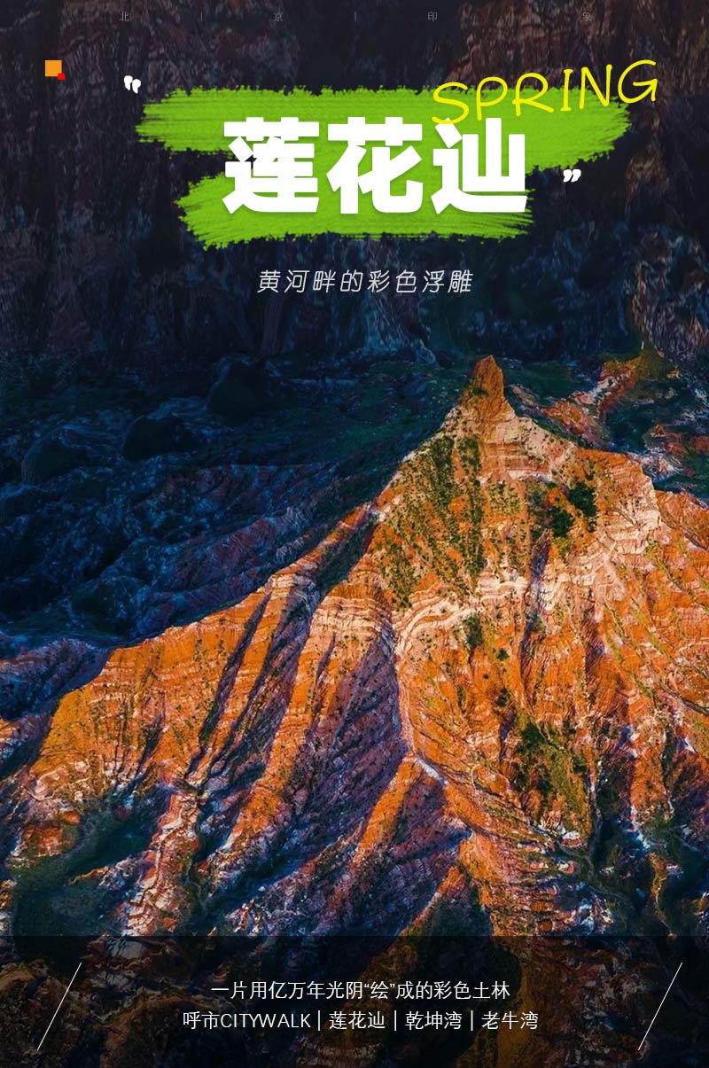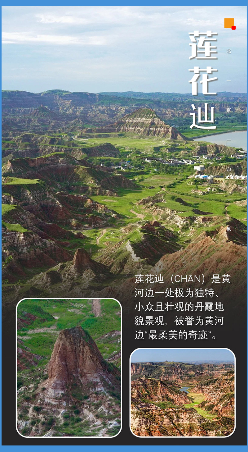 - 早上继续出发,前往当年吸引康熙皇帝的宝地—莲花辿,五彩斑斓壮若莲花的丹霞地貌,红白相间,绽放般盛开在黄土地腹地之上,仿佛在向每位游侠卖弄风骚,让我们知道陕北的土地上,不仅有苍茫,还有震撼人心的璀璨。“南有青木川、北有莲花辿”,我们在这里可以体验到一脚踩三省之感,犹如漫步在火星表面——畅快的过一把外星人的瘾!