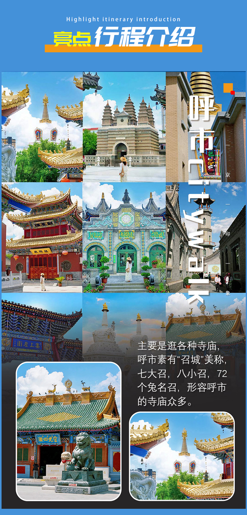 - 07:30|请按集合信息通知准时集合出发前往呼和浩特。下午抵达呼和浩特,根据自身需求选择相应景点。今天主要是逛各种寺庙,呼市素有“召城”美称,七大召,八小召,72个兔名召,形容呼市的寺庙众多。