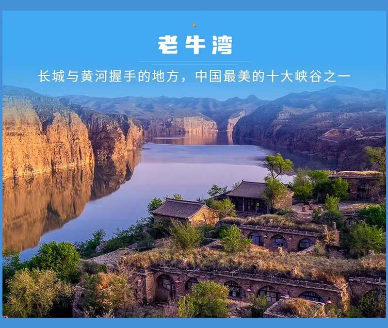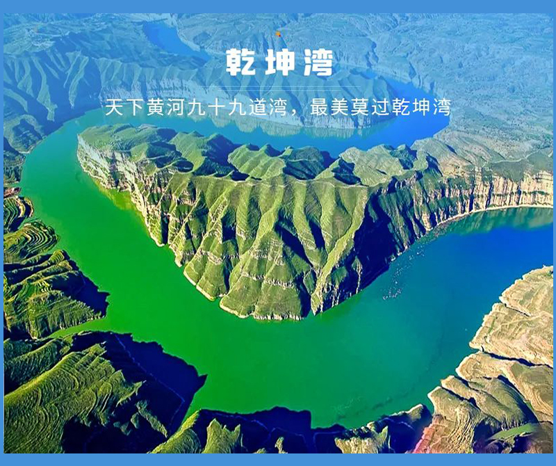 - 下午适时前往山西境内老牛湾,途经乾坤湾打卡拍照。乾坤湾,位于从万家寨到山西老牛湾的路上,也是景区的一大特色,180度长湾,将黄河母亲的婀娜体态形象地勾勒而出,极富观赏价值。