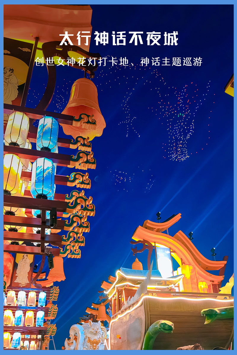 不夜城内,华灯初上,灯火阑珊,灯光成为另一种风景。主要由祈福广场、不夜城主街区、忘川神话美食街、创世女神花灯“打卡地”、神话主题巡游区、民俗社火巡游区等区域构成。太行神话不夜城的传统民俗大秀表演节目亦是丰富多彩,舞龙、抗桩、独辕四景车、喷火、糖画、跑旱船、斗鸡等一系列的民俗演绎轮番登场,在迷人的夜景下添了一抹色彩。还有本地神话文化,打造了后裔射日、精卫填海、女娲补天、神农尝草、大禹治水、人鱼传说、天女散花等剧目。(具体演出项目以景区官方公布为准)。