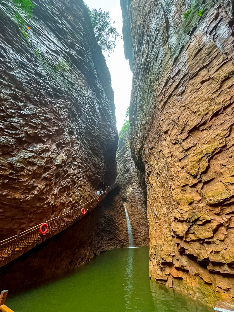 我们乘坐观光车-游船码头-峡谷爱心步行2公里-索道下站--索道山顶-玉皇宫-可坐空中巴士到达天空之城-天空之城电梯到达山底,全程需要5-6小时。有以下看点:1八泉峡的水色彩多变,下船至索道一处一景,水的深浅与光影的强弱都会影响水的色彩,非常漂亮;2爱心山谷是属于八泉峡特有的浪漫;3乘坐索道,欣赏山的壮美与辽阔,最美的山景尽收眼底。