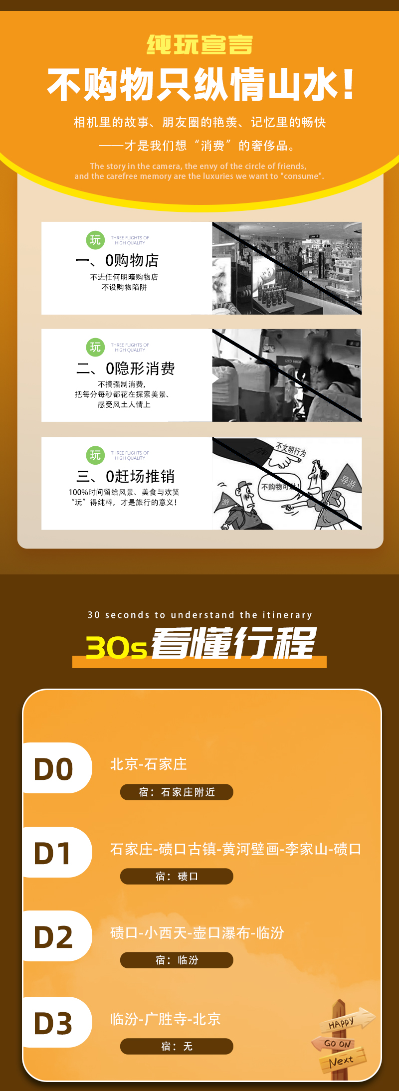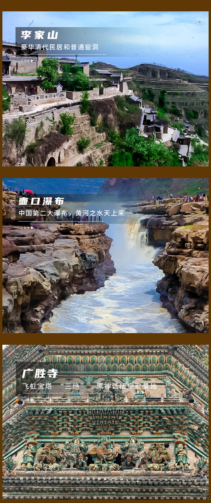2)门票:小西天35,壶口瀑布+景交车110,广胜寺70+15景交车,碛口古镇、李家山无门票,黄河壁画需坐船游览约60元/人,具体以实际为准;门票价格供参考,以景区实际政策为准;