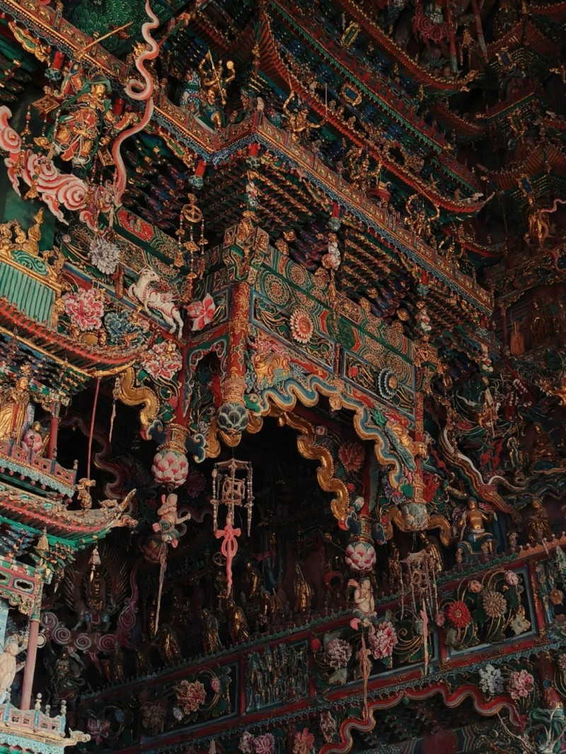 这是一座佛教禅宗寺院,是中国雕塑艺术史上的“悬塑绝唱”,是一场震撼人心灵的美学盛宴,1000 多尊彩塑如层峦叠嶂一般耸立着。169.6平方米的大雄宝殿里,这是从云端落下的富丽堂皇的极乐世界,乐伎轻歌曼舞,飞天安详飘动。