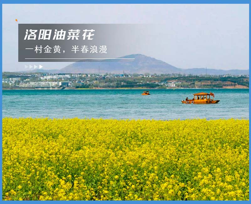 - 早上前往洛阳有“小洱海”之称的楼上村/岗上村欣赏当季醉美的油菜花海。楼上村坐拥陆浑湖畔大片油菜花海,盛花期 3 月下旬至 4 月。金黄花浪与澄澈湖水、远山相映,环湖步道、骑行环线贯穿其间。配套旅拍打卡点,是春日赏花休闲的热门去处。